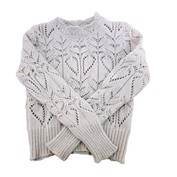 This product is a handmade cream wool chunky cable knit sweater in XS size. It features a solid pattern, cable-knit style, long sleeves, crew neckline, and is perfect for casual occasions during the winter and fall seasons. The sweater has a classic pullover style, making it a versatile and stylish addition to any woman's wardrobe. Made with quality wool fabric, this sweater is both comfortable and warm, ideal for colder weather. It is unlined.