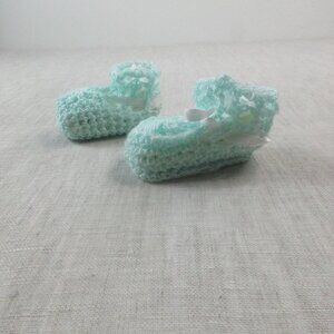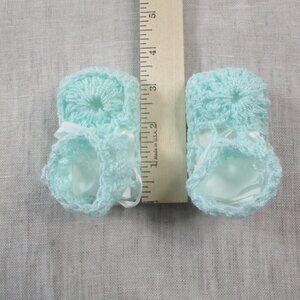 Handmade Crib Booties Baby Shoes Newborn Teal Crochet Knit Ribbon Soft.