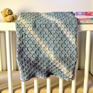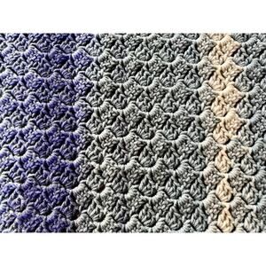 Soft, hand-crocheted afghan in misty blue, gray and cream with a tidy shell edge. Worked in the popular diagonal C2C (corner-to-corner) stitch that swept American home crafts in the late 20th century, this cozy throw brings heirloom charm to nursery, sofa, or reading nook. Easy-care acrylic yarn; the gentle gradient stripes suit cottagecore, coastal, farmhouse and Scandinavian décor alike. Size approx. 49" x 45"—great as a baby blanket, lap throw, or photo prop. Lightweight yet warm and beautifully textured.