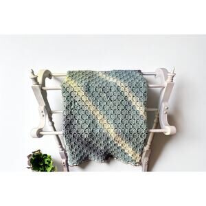 Soft, hand-crocheted afghan in misty blue, gray and cream with a tidy shell edge. Worked in the popular diagonal C2C (corner-to-corner) stitch that swept American home crafts in the late 20th century, this cozy throw brings heirloom charm to nursery, sofa, or reading nook.  Easy-care acrylic yarn; the gentle gradient stripes suit cottagecore, coastal, farmhouse and Scandinavian décor alike. Size approx. 49" x 45"—great as a baby blanket, lap throw, or photo prop. Lightweight yet warm and beautifully textured.