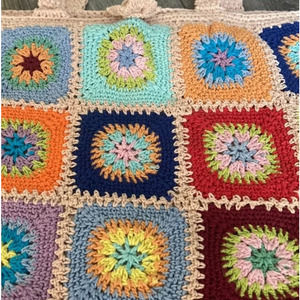 Features shoulder strap, zip top and crochet button closure. Base is a beautiful blush pink, crocheted with multi-colored yellow, blue, orange, green, purple, and red squares. Absolutely beautiful and perfect for a boho summer look. In absolutely perfect condition.