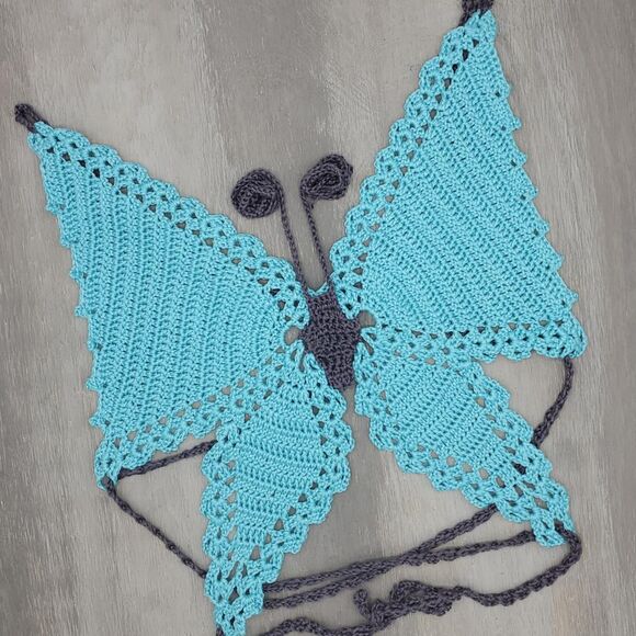 Obsessed with butterflies? Same. This handmade crochet crop top is shaped like a butterfly and stitched with love in sea green with Dark gray accents— the ultimate combo for making a statement. Perfect for festivals, beach days, or layering with your fave pieces for a cute streetwear vibe.