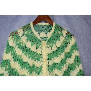 Handmade crochet cardigan featuring a bold green and pale yellow chevron pattern with an open-weave construction. Designed with a button-front closure, scalloped hem, and slightly cropped, boxy silhouette. Lightweight and breathable with a strong 1970s folk / bohemian aesthetic. Likely one-of-a-kind and artisan made.