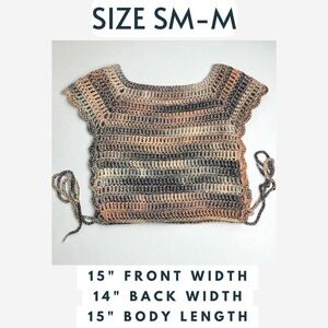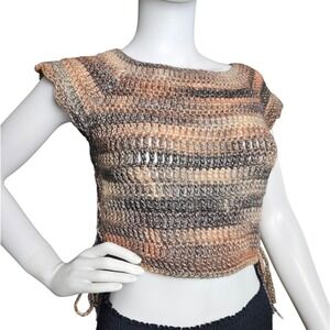 One-of-a-kind handmade crochet top featuring soft, earthy stripes in warm brown, beige, and copper tones. Designed with adjustable side ties for a custom fit and a slightly cropped cut, this piece blends comfort with boho style. Perfect for layering over bralettes, wearing to festivals, or styling for everyday casual looks.