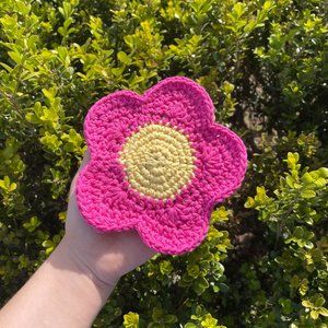 Three crochet daisy coasters in the colors orange, pink, and green. Wash on a delicate setting to prevent unraveling and air dry on a flat surface to keep the shape. The orange flower coaster is slightly smaller than the green and pink flower coaster to accommodate different-sized cups/drinks.