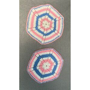 Handmade Crochet Doilies Set of 2 Rainbow Hexagon Pink Blue White 7" Diameter
