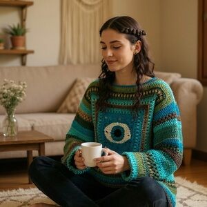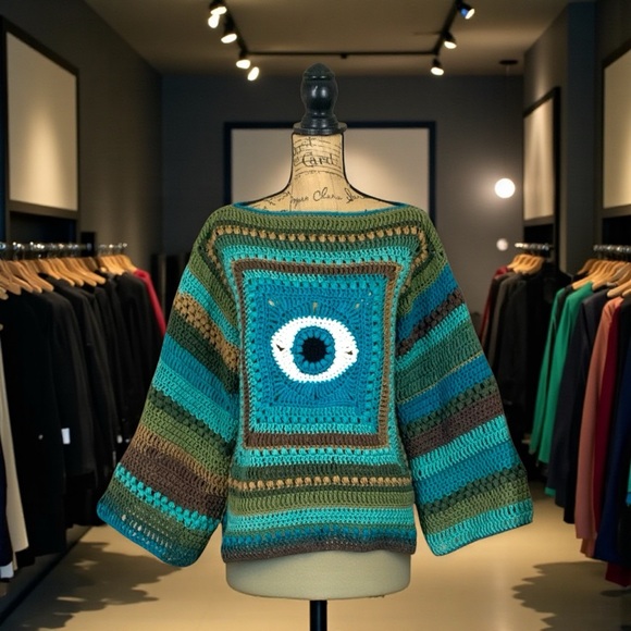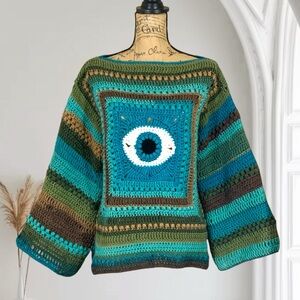 Handmade Crochet Evil Eye Sweater New handcrafted Bohemian Wide Sleeved