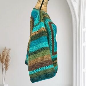 This hand-crocheted sweater offers a unique tactile experience with its puff stitches. The wide sleeves provide a comfortable and flowing fit. The bohemian-inspired color palette of turquoise, brown, and green evokes a sense of earthy warmth. This sweater is a beautiful example of handcrafted artistry. It would make a stylish addition to any wardrobe.