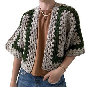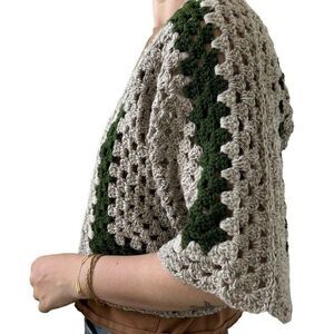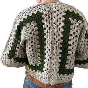 Handmade Crochet Granny Square 100% Wool Cardigan Tan Green Retro Hippie Sz M
