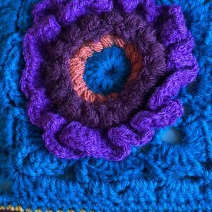 Keywords: granny square blanket, handmade crochet, textile wall art, colorful yarn art, 3D flower crochet, boho home decor, vintage craft aesthetic, maximalist fiber design, cottagecore handmade, artistic crochet
