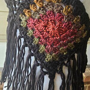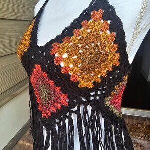 Elevate your boho style with this handmade crochet halter top! Featuring vibrant granny square detailing in warm autumn hues, intricate black lace crochet, and a stunning fringe finish, this top is perfect for festival season, beach days, or casual summer wear.