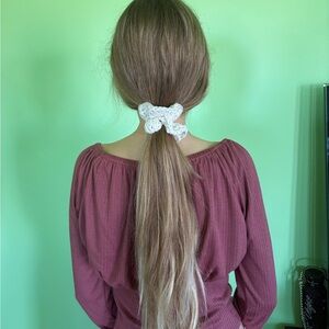 Set of crochet hair scrunchies in cream and yellow. Perfect for adding a touch of color to your hairstyle.