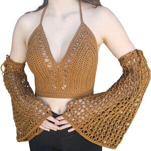 🔥 Festival-ready + totally unique! This handmade crochet halter top features a deep V neckline, flattering vertical stitching, and openwork details. Comes with detachable and size adjustable, matching mesh sleeves with dramatic flared cuffs for that extra boho flair. The top has adjustable straps to fit a size extra small to medium.