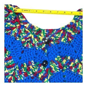 Handmade Crochet Knit Zigzag Poncho Button Closure Blue Yellow & Design Vintage
