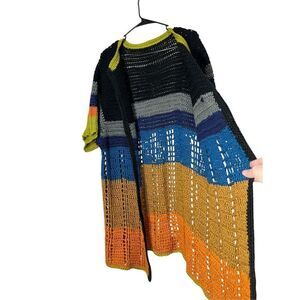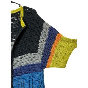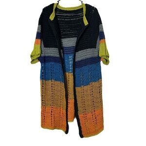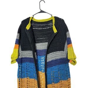 Handmade Crochet Open Front Cardigan. Short sleeve. Colorful. Based on measurements I would say it would fit an XL up to 2XL. Very well made. Long line