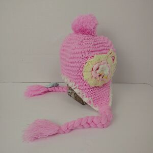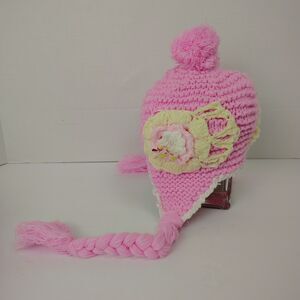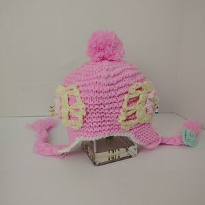 Adorable hand-crocheted pastel beanie with braided tassels sweet flower appliques.