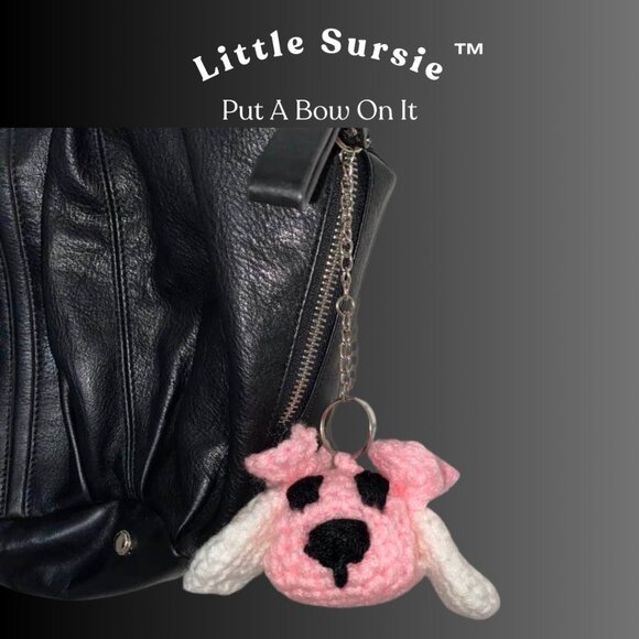 Handmade Crochet Pink Puppy With Bows Amigurumi Put A Bow On It Crocheted Plush Keychain or Purse Charm. Handmade by me. All Little Sursie handmade items are brand new. Some listings made to order. Measurements may slightly vary.