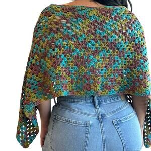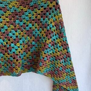 Colorful handmade crochet poncho in green, teal, brown, and gold tones.