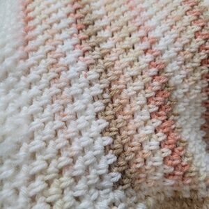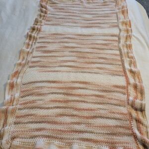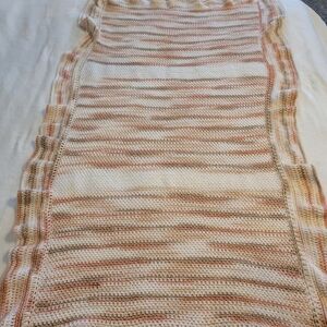 Gorgeous super soft crocheted blanket. Rectangle in size with a slightly ruffled border. Pinkish salmon, cream, white, tan and light brown colors. Great condition. Measurements taken flat.
