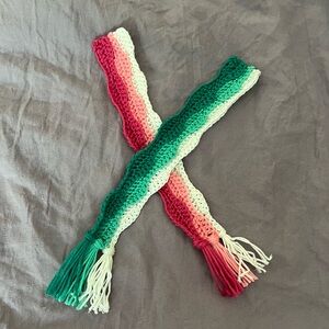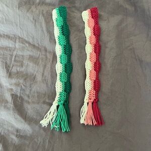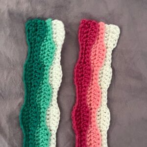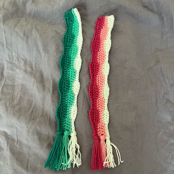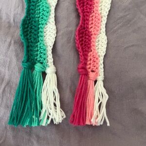Pair of 2 handmade crochet ripples bookmarks, one pink gradient, one green gradient, each about 7 in. long; perfect gift for book lovers or to spoil yourself ;)