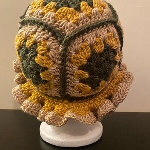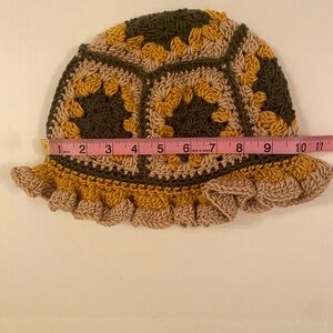 Add a touch of charm to your outfit with this handmade crochet ruffle hat. Featuring a delightful mix of gold, green and beige, this accessory is perfect for any occasion.