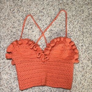 This handmade crochet top features a charming ruffle design. Perfect for adding a pop of color to your wardrobe.