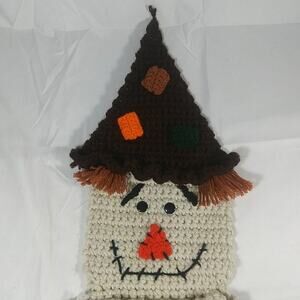 Add a touch of autumn to your home decor with this unique handmade crochet scarecrow. Measuring 23 inches in height and 16 inches in width, this one-of-a-kind piece is perfect for hanging on your door or wall. Its multicolor design, made from yarn with plastic eyes, features a scarecrow pattern and shape, making it a great addition to your Halloween or fall decorations.