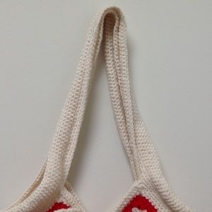 A unique and colorful crochet shoulder bag made with 13 square shape sawed with decorative crochet flower. 27" double strap. No pockets or compartments. Made with Acrylic fiber yarn.