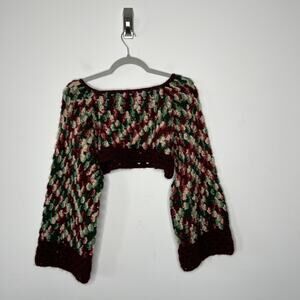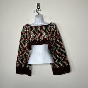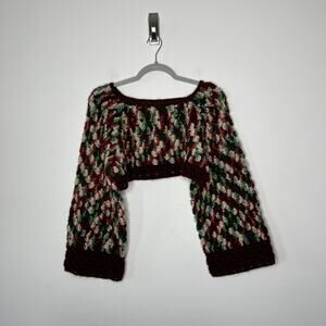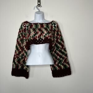 Handmade Crochet Sweater Womens Small Burgundy Green Crop Boho Bell Sleeve