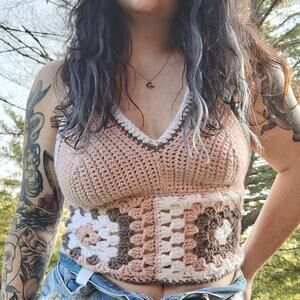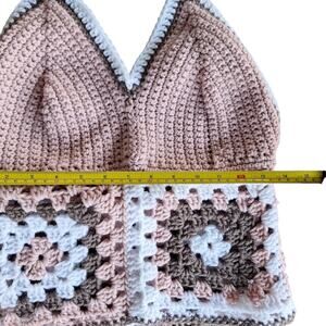 In very good condition handmade crop chunky knit halter top pastel pink brown white granny square afghan like design .see measurements fits like a medium