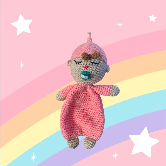 Adorable crocheted sleeping baby doll. Features a pink body bobble head and pacifier. Best gift to add to any little girls toy box. As well as a great cuddling gift.