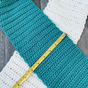 Beautiful new condition hand made knit crochet color block fall autumn or winter scarf with white and teal blue / green color. Approx 54” total length.