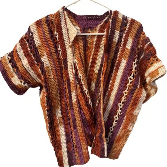 Vertical stripes in various autumnal colors, red, purple, orange and cream.