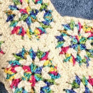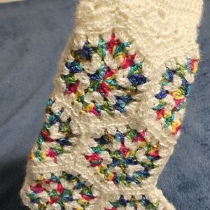 squares are worked in white and multi colored soft acrylic yarn, the top detailing is all white. includes built-in hanging loop