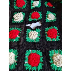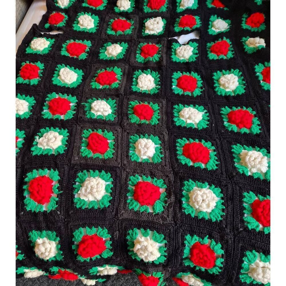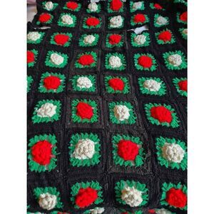 handmade crochet afghan blanket made of granny squares. The squares feature a three-dimensional floral design, likely representing poinsettias, in a color scheme of black, red, and white with a green border. This type of blanket is often associated with a vintage or holiday style