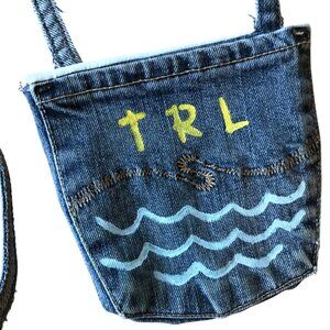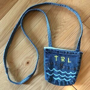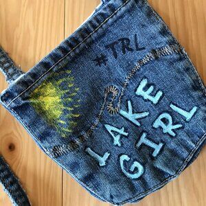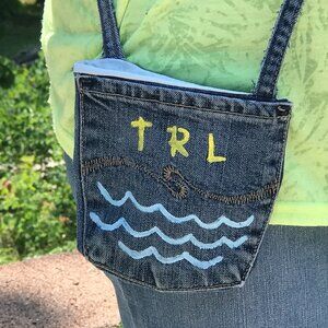 Painted denim purse, crossbody bag, blue jean pocket pouch. This is an upcycled over-the-shoulder cross body cell phone hip bag, handmade and painted on both sides with a Table Rock Lake (TRL) theme. It is fully lined with 1 pocket on both the front and back in addition to the middle area inside. It is a perfect size to hold some essential items but small enough to be very cute!