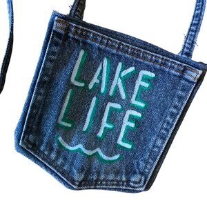 Painted denim crossbody bag, blue jean pocket pouch. This is a cute over-the-shoulder cross body cell phone hip bag, which is handmade from upcycled jeans and "Lake Life" painted onto the front. There is a pocket on both front and back in addition to the larger inside area. This is a perfect size to hold essential items and would make a great gift for the lake lover in your midst!