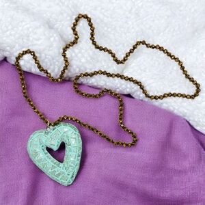 Make a bold statement with this stunning handcrafted mosaic heart pendant necklace! Featuring a mint-colored heart adorned with shimmering crystal mosaic tiles, this one-of-a-kind piece is strung on a long 36" crystal beaded chain in an earthy bronze tone. A boho-chic masterpiece that adds elegance and personality to any outfit!