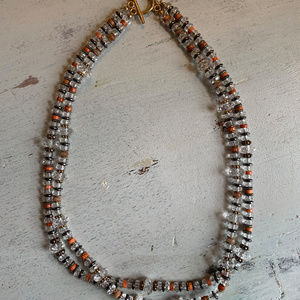 Hand-strung double strand crystal & sun stone necklace. Cut crystal and polished sun stone beads range from 1 mm to .5 mm and are strung with thin silver and metal textured beads for a rich effect. The glittery 18-inch long necklace has a simple toggle clasp and the bead strands overlap so the larger crystals are staggered. Sun stone symbolizes optimism and enthusiasm. The necklace is from the collection of Arizona beader Bette Publicker and is one-of-a-kind.