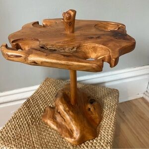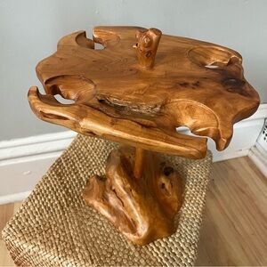 From in front of a roaring fire in your log cabin getaway to the balcony of your beachfront retreat, this teak slab wine table will be right at home and always in style.