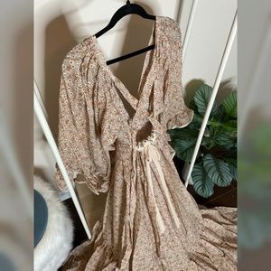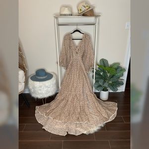 This is a handmade gown customized in Victoria, Canada from WeAreReclamation. This gown’s print shows beautiful hues of oranges, maroons, creams & whites on a light brown background. This gown is size adjustable fitting anyone from am XS-L with straps in the back that are adjustable and an elastic band. There is one leg slit feature that can be used to show off some skin or keep it closed & no one will even know it’s there! This gown has never been worn and was only unpackaged to take pictures of for resale. I purchased this gown for a photoshoot but unfortunately it didn’t come in on time. I would like to resale for the price I purchased for (minus the Canadian taxes + shipping price,) however, I am open to any offers! This gown would make a great client closet piece for photographers with its sizing versatility