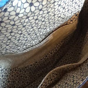 Large shoulder bag made from deep dark denim with contrasting side panels. The flap of this purse is made from an antique hand-stitched quilt with a blue edge and white center. The quilt has many colors and patterns of feedsack fabric with shades of blue, green, red, purple, brown, yellow and pink. This purse is lined in a fun doodle-daisy print calico cotton in beige and navy blue. There are 2 large flap pockets on the inside.