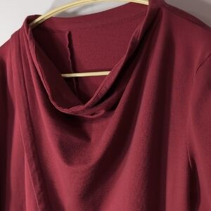 Stylish handmade dark red tunic dress with long sleeves. Features a unique draped neckline and side pocket. Super comfy and stretchy material.