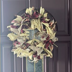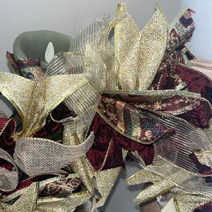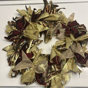 Handmade Dark Red Tan Gold Holiday Christmas Ribbon Twine Wreath Made on 12”