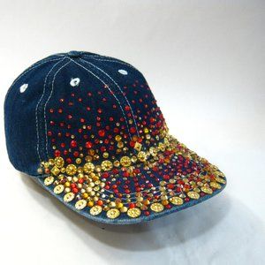 Handmade Denim Red Gold Rhinestone Studded Glittery streetwear Baseball Cap Hat