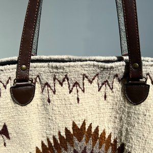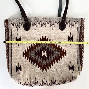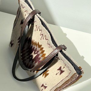 100% premium wool. Genuine leather, Black cotton lining, and Hand-dyed and handwoven.