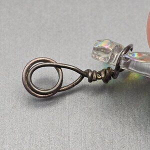 The surface glows with a subtle shimmer, reminiscent of abalone shell or holographic foil, while the hand-wrapped wire loop adds a rustic, organic touch. Slight tarnishing on the wire enhances its handmade character, giving the piece a grounded, earthy elegance.