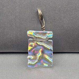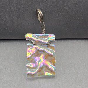 his handmade dichroic glass pendant may be small in size, but it radiates a bold, artistic spirit. Measuring 1.25" tall by 0.625" wide, the rectangular glass slab showcases a wavy, iridescent pattern that shifts between hues of pink, green, blue, and gold, depending on the light and angle.