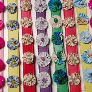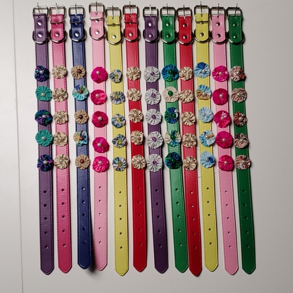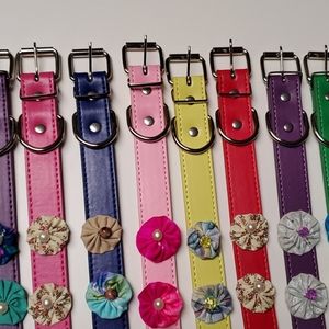 These dog collars are handmade and never worn. The leather like band measures 1 inch by 20 inches. It equals the size of a store bought medium/ large. Purchase several at a bundle price of 3 for $12