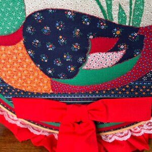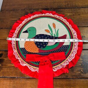Handmade Duck Embroidered & Appliqué Wall Hanging Red Ruffle Lace Trim 16" Dia